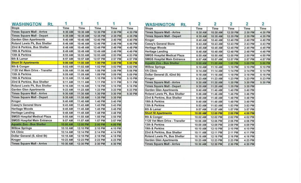 ATTENTION MT. VERNON CITY SHUTTLE RIDERS…The Washington 1 & 2 shuttle route is being revised. EFFECTIVE May 1, 2026, we will be stopping at 13th & Perkins (Sunshine Senior Nutrition Center). With this newly added stop, times at existing stops may have changed. For your convenience, we are including the revised Washington 1 & 2 route schedule with this post. Please take a minute to review the revisions to this route and plan accordingly.
